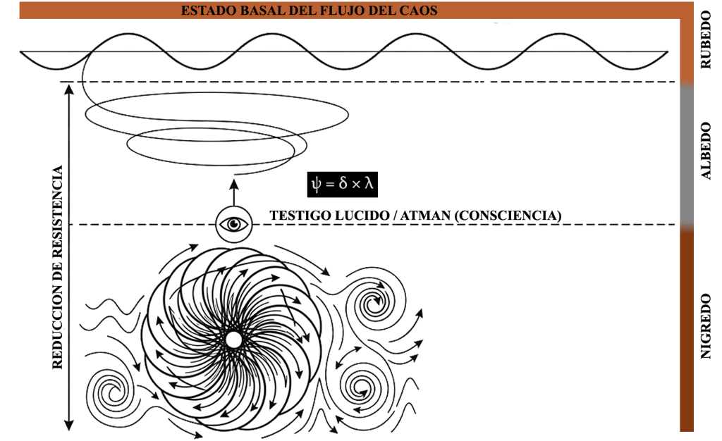 "Estableciendo que Ātman (Yo espectador) es la Gota y que el Océano es el Flujo del Caos, un Caos que nos respira desde la Atmósfera condensada (Parabrahman) hasta la última gota. Podemos comprender el Océano del Flujo del Caos como un fluido con las mismas propiedades que Rubedo: sincronía con el todo, fluir sin fricción.